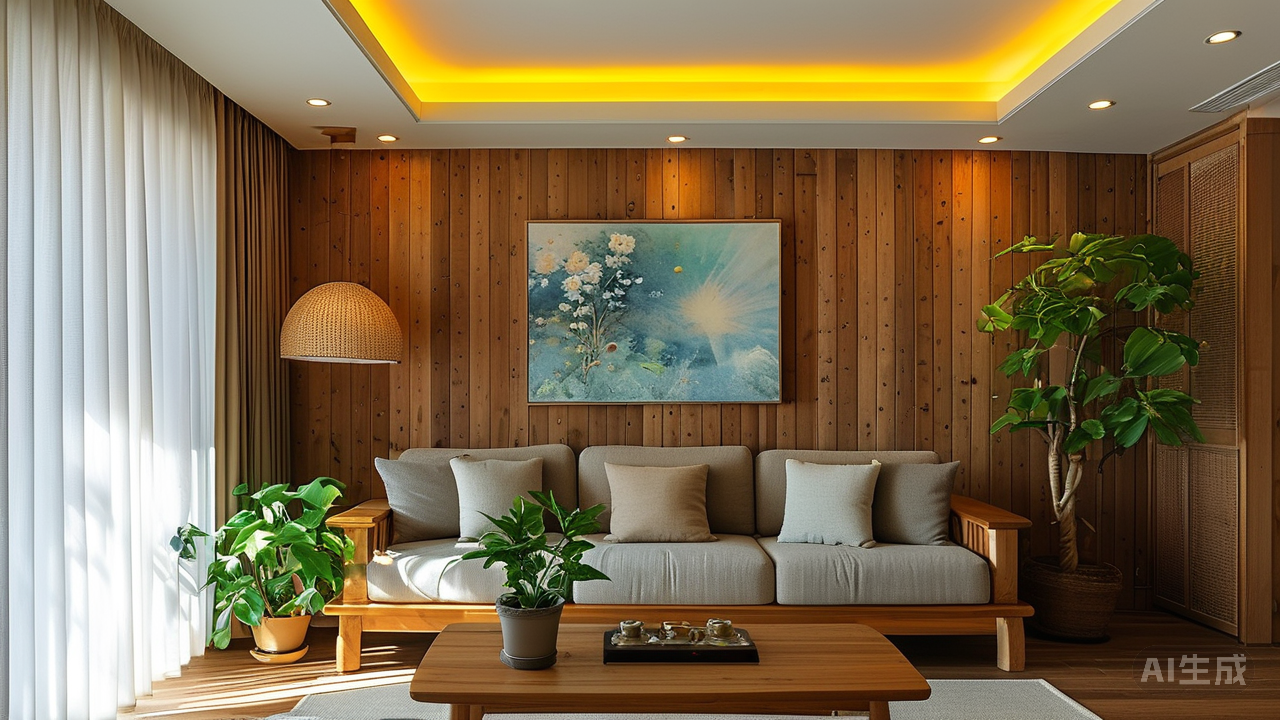 灯光设计亦是点睛之笔。隐藏式的灯带嵌入天花板四周,暖黄色的光晕均匀洒下,既不刺眼又能充分烘托氛围。重点照明则落在那些关键的节点上:一束光打在悬挂于木墙上的艺术画作上,使其成为视觉焦点;另一束聚焦于角落摆放的绿植盆栽,蓬勃生机在光影交错间更显盎然。透过纱帘过滤后的阳光慵懒地斜照进来,斑驳陆离地投射在地面上,随着时间游走变幻模样,为静态的空间增添了动态之美。
