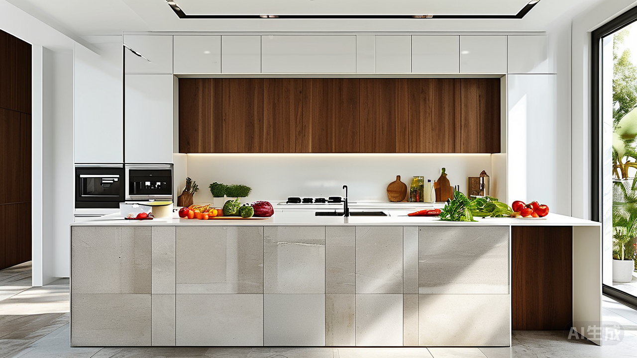 更为巧妙的是,这种一体化的设计还充分考虑到了实用性与美观性的平衡。大板瓷砖易于清洁的特性,让日常打理变得轻松简单;而其优异的耐磨性能,则确保了即便是高频使用的厨房区域也能历久弥新。此外,通过合理的布局规划,岛台既可以作为备餐区,也可以成为家人聚餐、交流情感的场所,真正实现了功能与美学的双重融合。